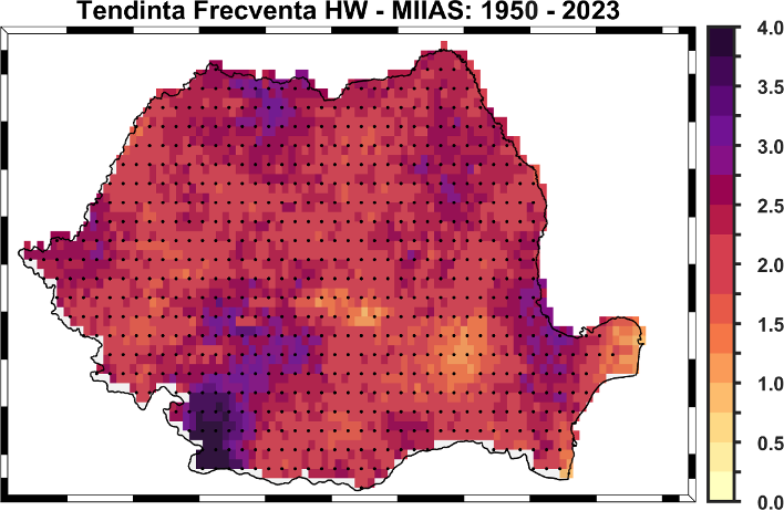 Datele arată că în România se înregistrează o creștere semnificativă din punct de vedere statistic atât a duratei cât și a frecvenței valurilor de căldură (Figura 2). Majoritatea regiunilor au înregistrat o creștere a duratei valurilor de căldura între 10 și 15 zile, în ultimii 74 de ani, în timp ce în sud-vestul și estul țării (în apropierea Mării Negre) s-a înregistrat o creștere mai mare de 25-30 de zile în decursul anilor 1950-2023 (Figura 2a). În ceea ce privește frecvența valurilor de căldură (Figura 2b), se înregistrează o creștere semnificativă în toată țara, cele mai afectate județe fiind Mehedinți, Dolj, Brăila, Galați, Maramureș, Bacău și Neamț. De exemplu, în județele Mehedinți și Dolj se înregistrează o creștere de 4 valuri de căldură pe durata ultimilor 74 de ani.