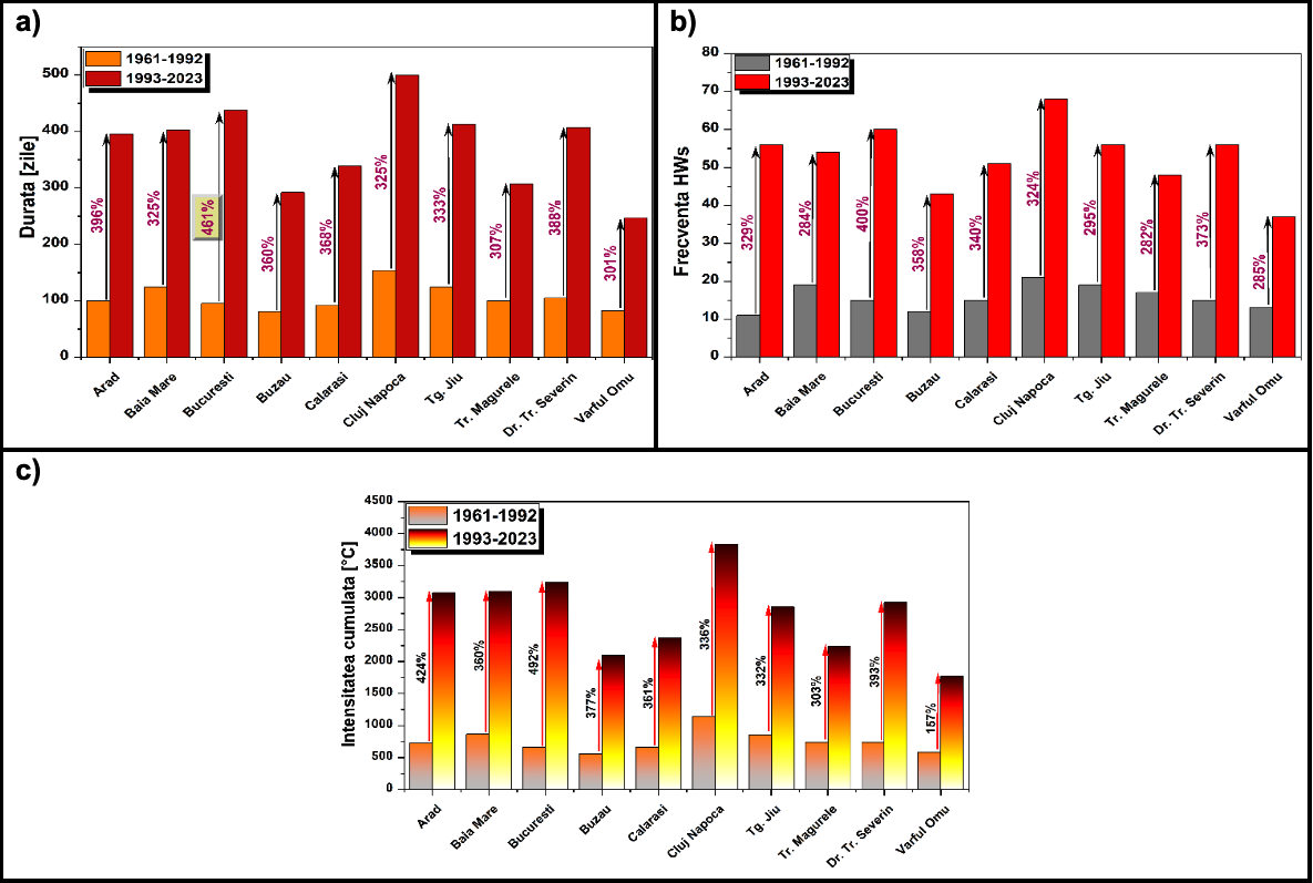 Cele mai pronunțate creșteri s-au constatat la stația meteorologică București Filaret (+461% durată, +400% frecvență), urmată de stația Arad (+396% durată, +329% frecvență) și Drobeta Turnu Severin (+388% durată, +373% frecvență). Toate stațiile au înregistrat creșteri semnificative din punct de vedere statistic atât în ceea ce privește durata cât și frecvența între cele două perioade (p<0,001, testul Wilcoxon). O evoluție similară poate fi observată și pentru intensitatea cumulată a valurilor de căldură (Figura 3c), cu cea mai mare diferență între perioadele analizate observată la București Filaret (+492%) și Arad (+424%), în timp ce, cele mai mici diferențe au fost observate la Târgu Măgurele (+303%) și Vârful Omu (+157%). Aceeași analiză a fost efectuată la 31 stații meteorologice de pe teritoriul României și toate stațiile examinate prezintă o creștere de cel puțin 250% a duratei, frecvenței și intensității cumulate în perioada 1991-2023 comparativ cu perioada 1961-1990, stațiile din sud și est fiind cele mai afectate.