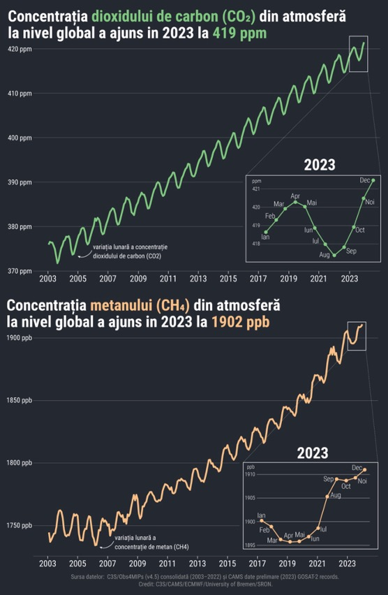 În plus, concentrația de metan (CH4) a crescut cu 11 părți per miliard (+/- 3 ppb) în 2023, ajungând la 1902 ppb. CH4 contribuie la aproximativ 28% din creșterea temperaturilor globale. Potrivit Copernicus, nivelurile de CO2 din atmosferă în 2023 au fost cele mai ridicate din ultimii cel puțin 2 milioane de ani, iar concentrația de CH4 a atins cel mai înalt nivel din ultimii 800.000 de ani. Aceste cifre subliniază gravitatea situației și necesitatea unor măsuri urgente pentru reducerea emisiilor.