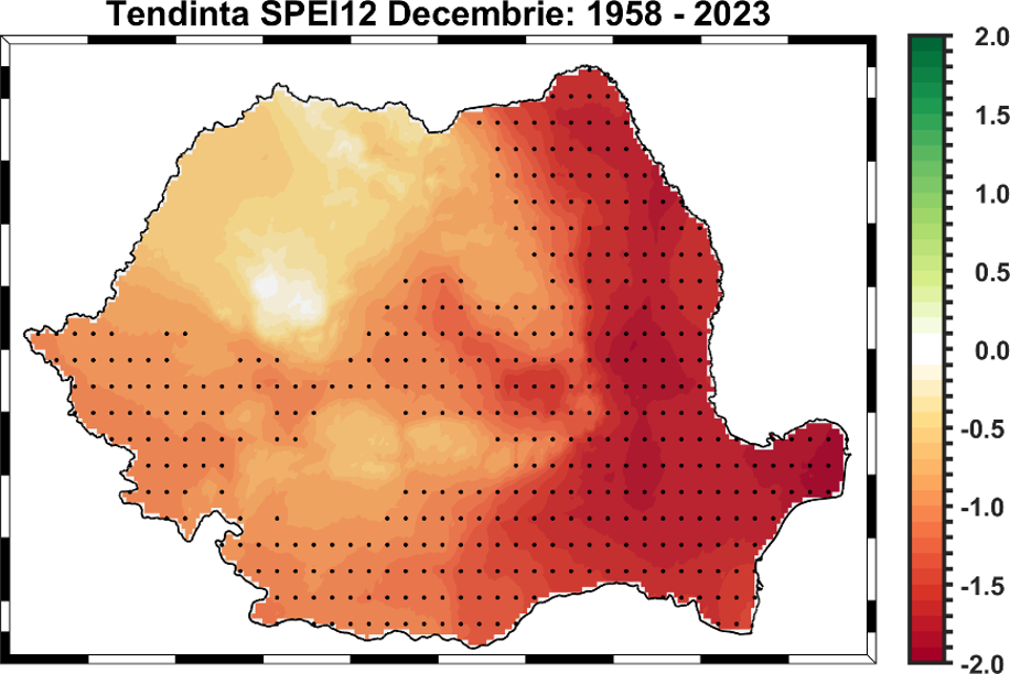 Dacă ne uităm la datele ce caracterizează condițiile de secetă acumulate pe o perioada de 12 luni putem observa că cele mai afectate zone, în care tendința de uscare este semnificativă din punct de vedere statistic, sunt cele din afara Arcului Carpatic, și anume partea de sud și de est a țării.