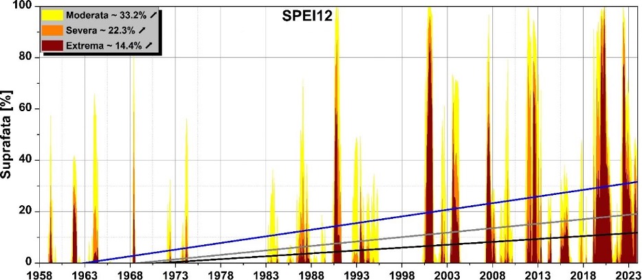 În ultimul deceniu, Europa a trecut prin mai multe veri extrem de secetoase, cum ar fi cele din 2015, 2018 și 2019, documentate pe larg în cercetările anterioare (Bakke et al. 2020; Hari et al. 2020; Ionita et al. 2017; Laaha et al. 2017). Pentru a înțelege mai bine impactul secetelor recente în România și a le pune într-o perspectivă istorică, am analizat suprafața țării afectată de trei tipuri de secetă: moderată, severă și extremă.