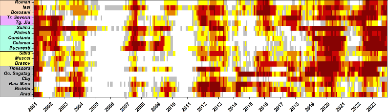 Zonele hașurate indică tendințe semnificative din punct de vedere statistic (99% nivel de semnificație). Sursa datelor: RoClib (Dumitrescu et al. 2023).