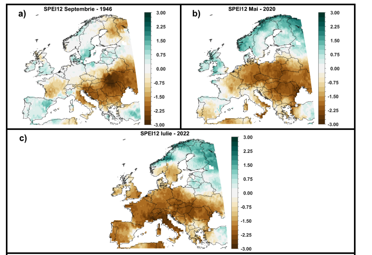 Comparație spațială a principalelor secete la nivelul României. Prezentate sunt doar lunile când s-a atins maximul, în termeni de intensitate, pentru primele 3 evenimente analizate pentru perioada 1901 – 2023. a) SPEI12 - Septembrie 1946; b) SPEI12 - Mai 2020 și c) SPEI12 - Iulie 2022. Valorile de culoare albastră indică regiunile afectate de un excedent de umezeală/precipitații, în timp ce valori de culoare maro indică regiunile afectate de secetă.
