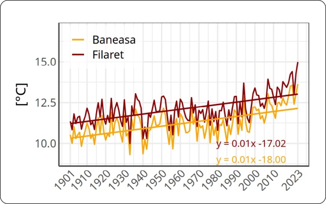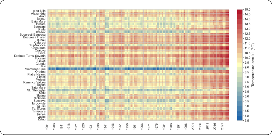 Temperatura aerului a crescut considerabil în toate orașele României, mai ales după anul 2000 (Figura 1). În orașele din sudul țării – precum Buzău, Călărași sau Craiova –, cele mai mari temperaturi medii anuale ajungeau în secolul trecut până la 12-12,5°C, în timp ce după 2010, s-au depășit 13,0°C în aproape toate orașele reședință de județ. În orașele de munte temperaturile medii anuale au ajuns la valori neatinse în deceniile precedente. Astfel, în 2023 și 2024 s-au depășit pentru prima oară în ultima sută de ani 10°C, la Brașov, și 8°C la Miercurea Ciuc.